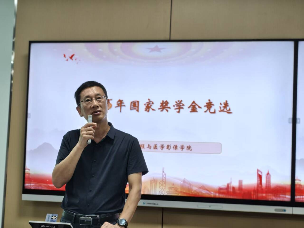 10月8日晚,生物医学工程与医学影像学院2024-2025学年国家奖学金竞选答辩会顺利举行。学院党委书记潘盛信到参加活动并总结讲话、党委副书记石裹莹、副院长杨时骐、余维,专业负责人彭微、吴迪等老师担任评委,2025级全体新生及团委学生会工作人员到场观摩学习。